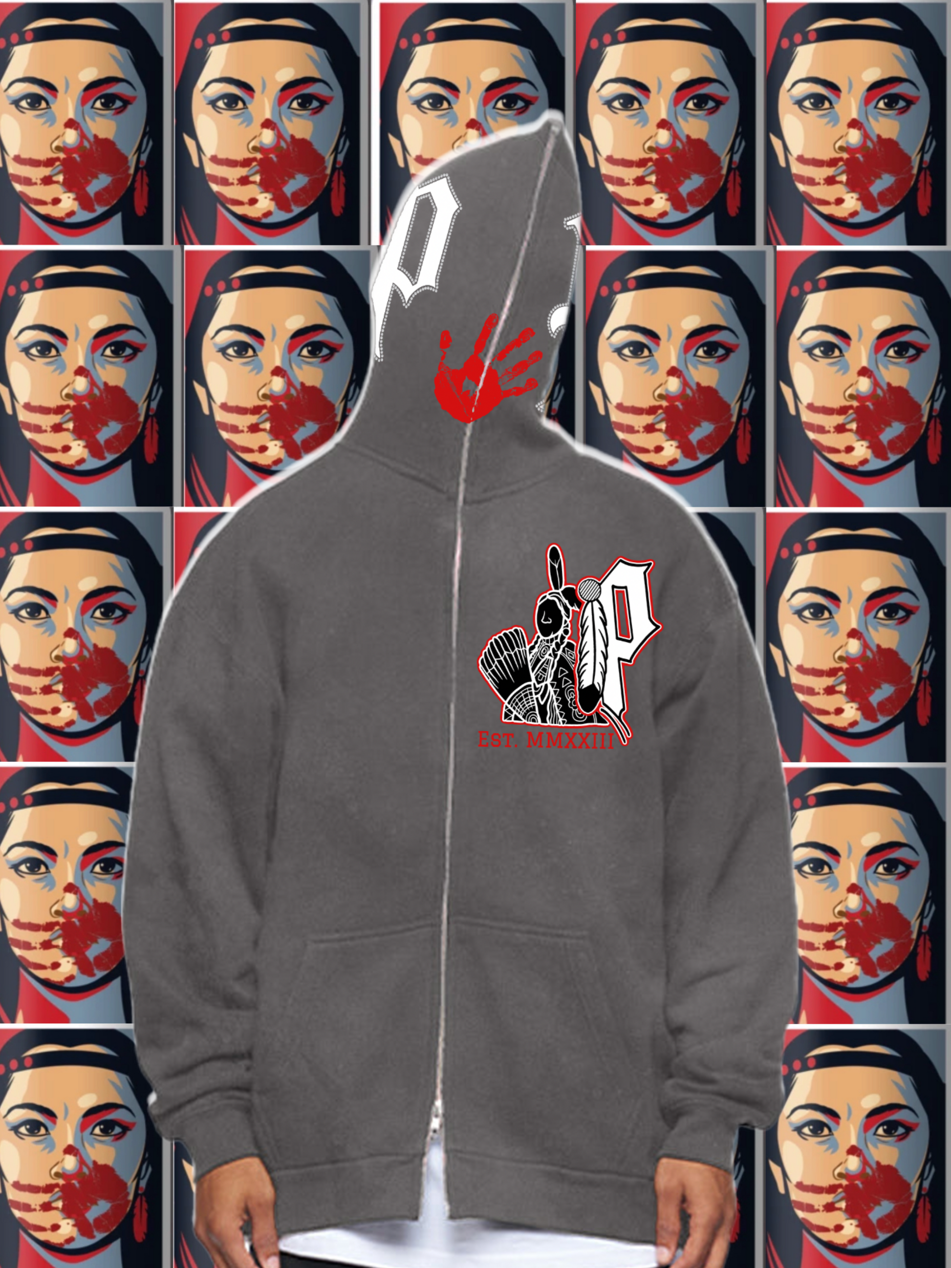 Murdered & Missing Indigenous Woman Full Zip Rhinestone Hoodie is my way of bringing awareness to the violence to not only women but , all indigenous population & tribes across North America To Canada.
